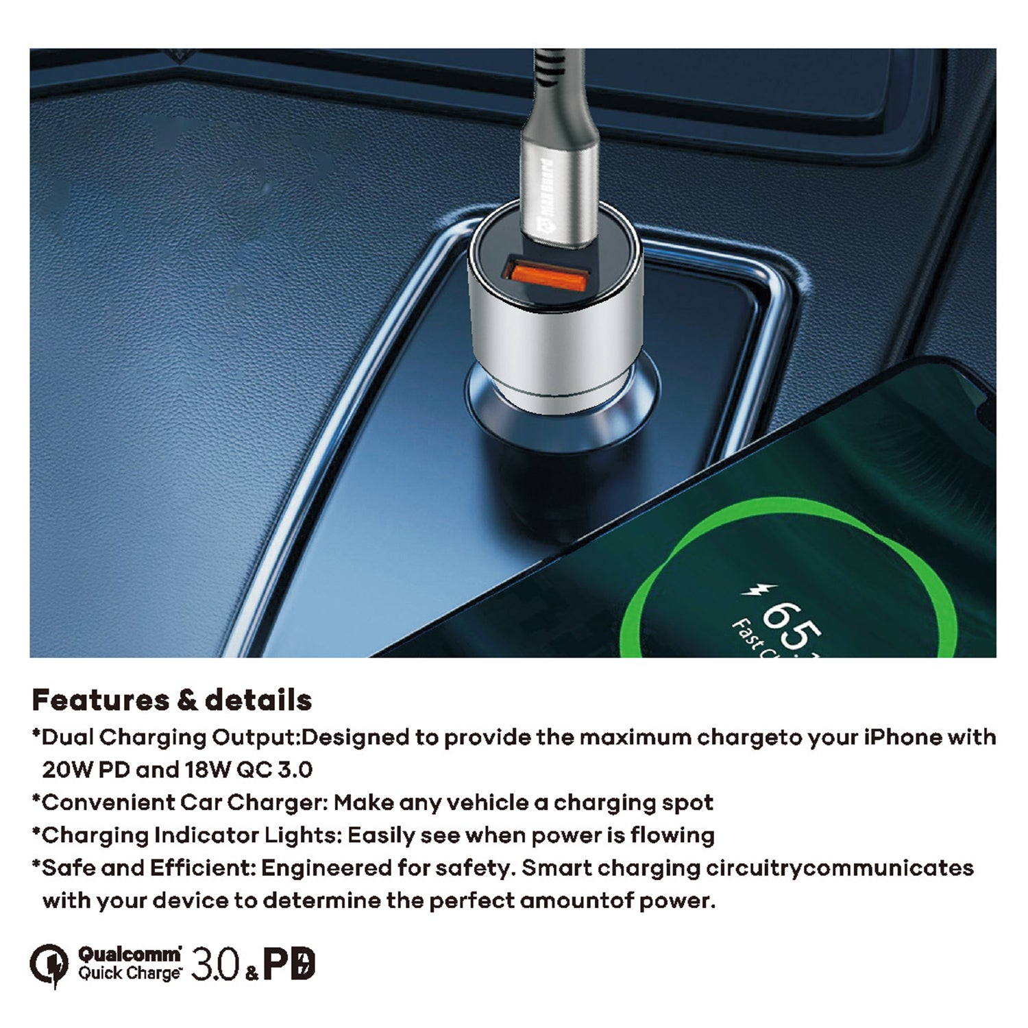 Car Charger with Dual Charging Output mc036LC with type c to lightning cable